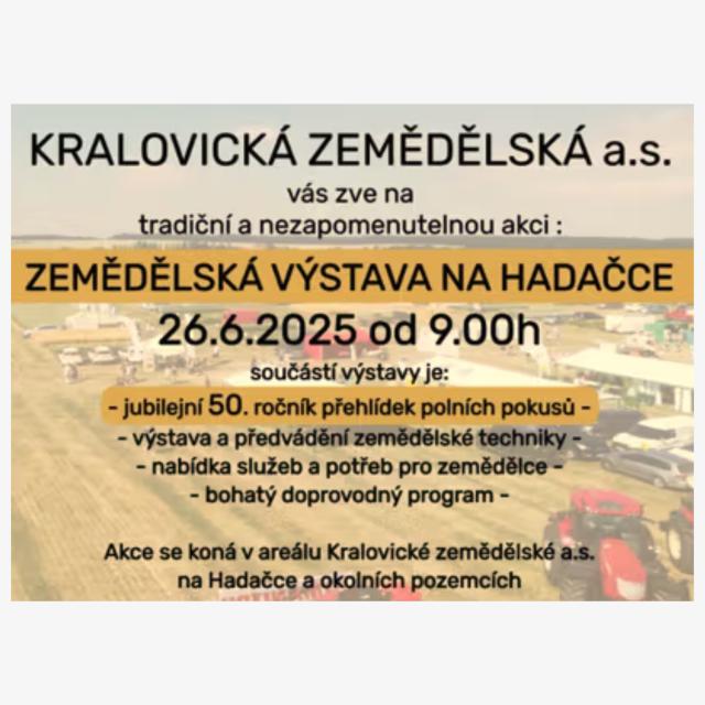 Srdečně Vás zveme na tradiční již 50. ročník zemědělské výstavy na Hadačce, která se koná v areálu Kralovické zemědělské a.s.