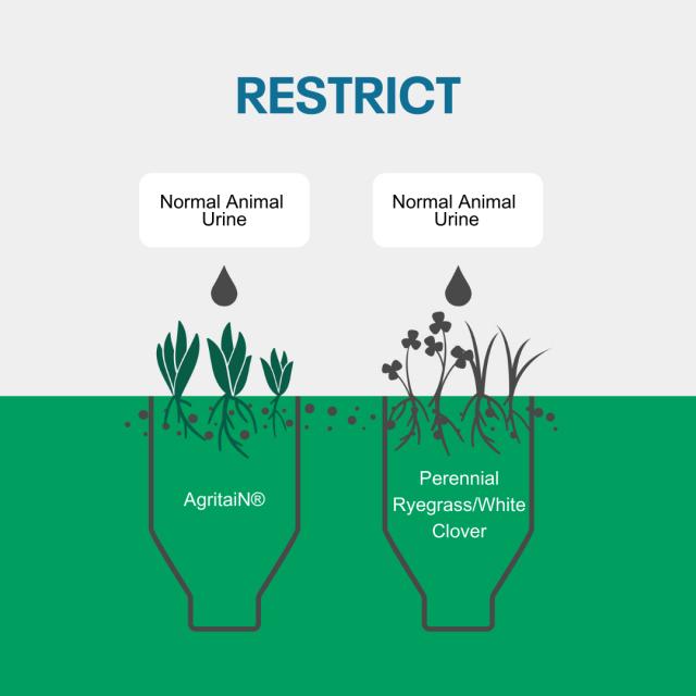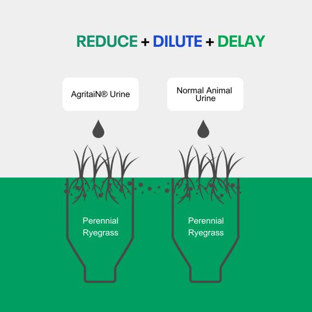 Zředění - Dilute: AgritaiN® má močopudné vlastnosti, což zvyšuje objem moči a snižuje koncentraci dusíku. Zvířata močí častěji, což snižuje koncentraci dusíku na jednom místě.