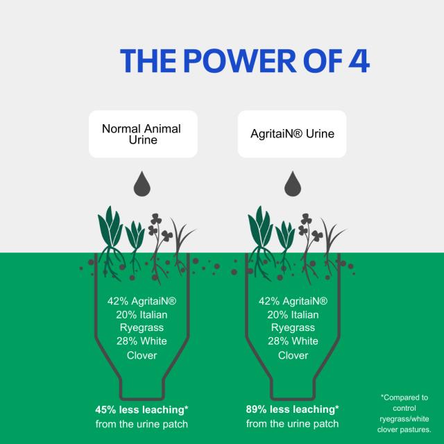 AgritaiN je přírodní, ekologické krmné řešení, které snižuje vyplavování dusíku z močových skvrn – až o 89 % v závislosti na složení porostu*.